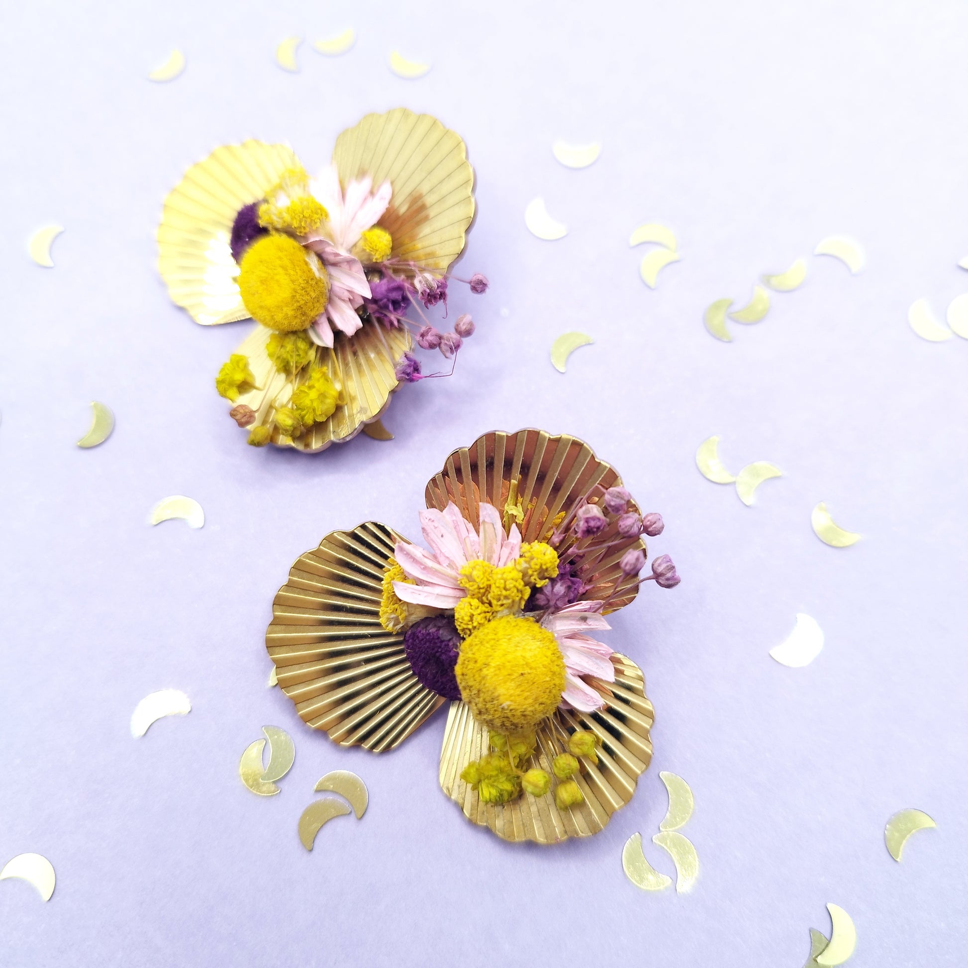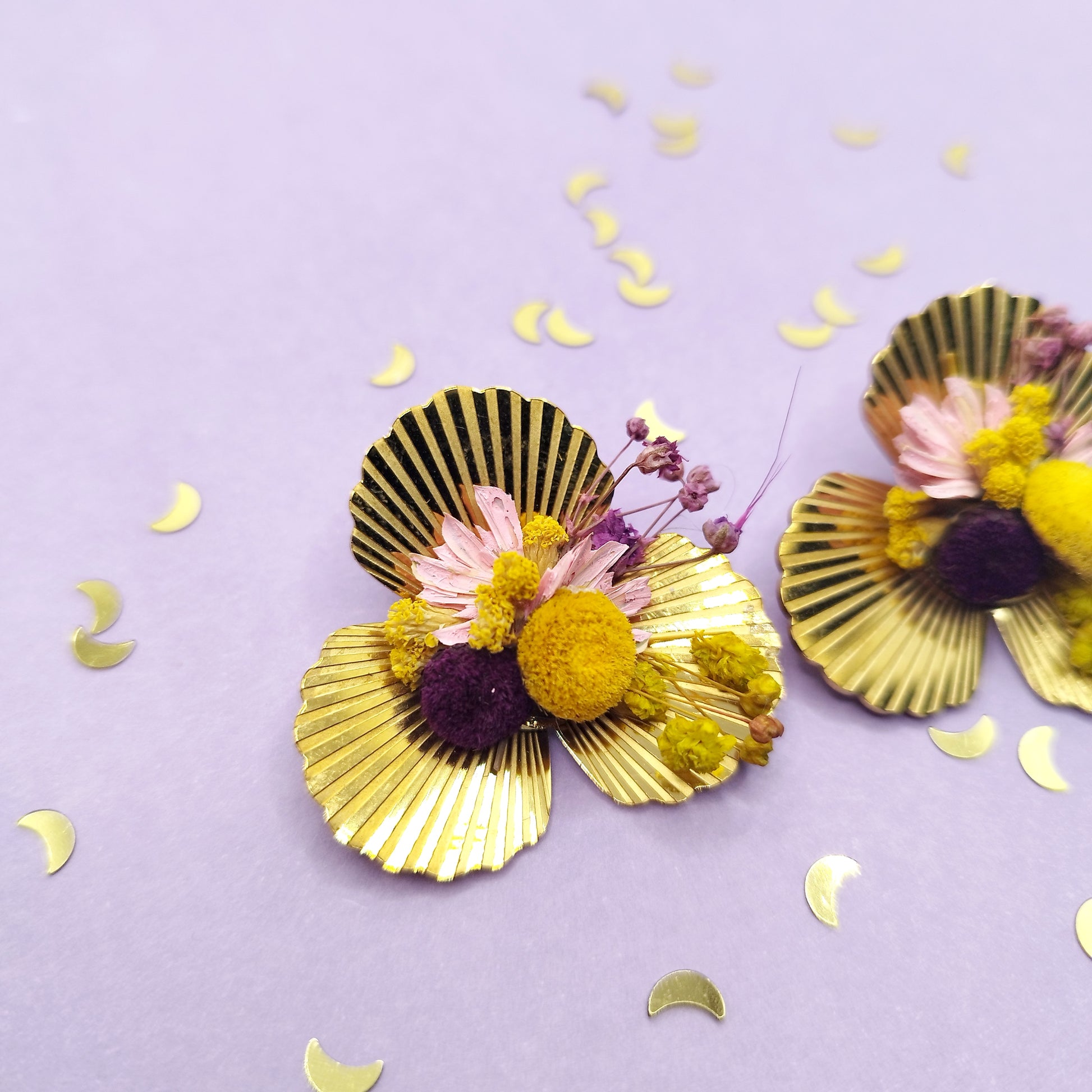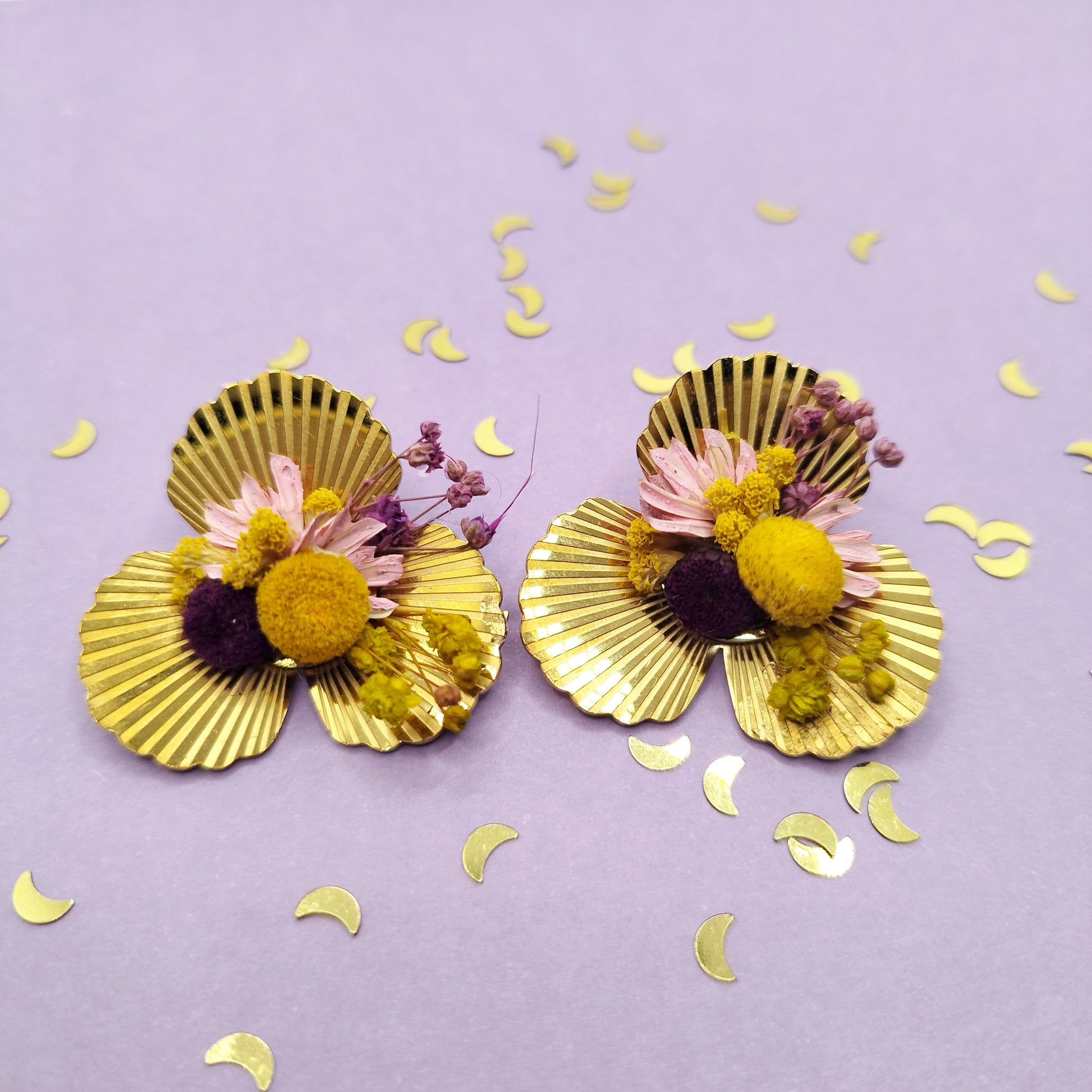 💘Cupidon a frappĂ©- Puces d’oreilles dorĂ©es fleurs sĂ©chĂ©es.