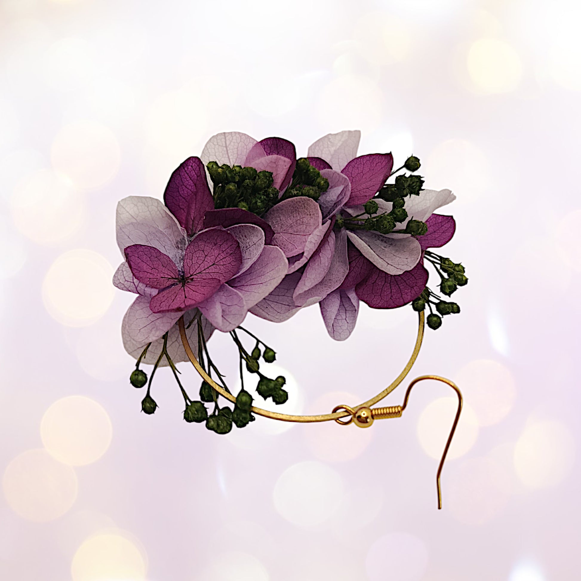 Chaque boucle se compose d'un cercle de laiton délicatement orné de fleurs d’hortensia.