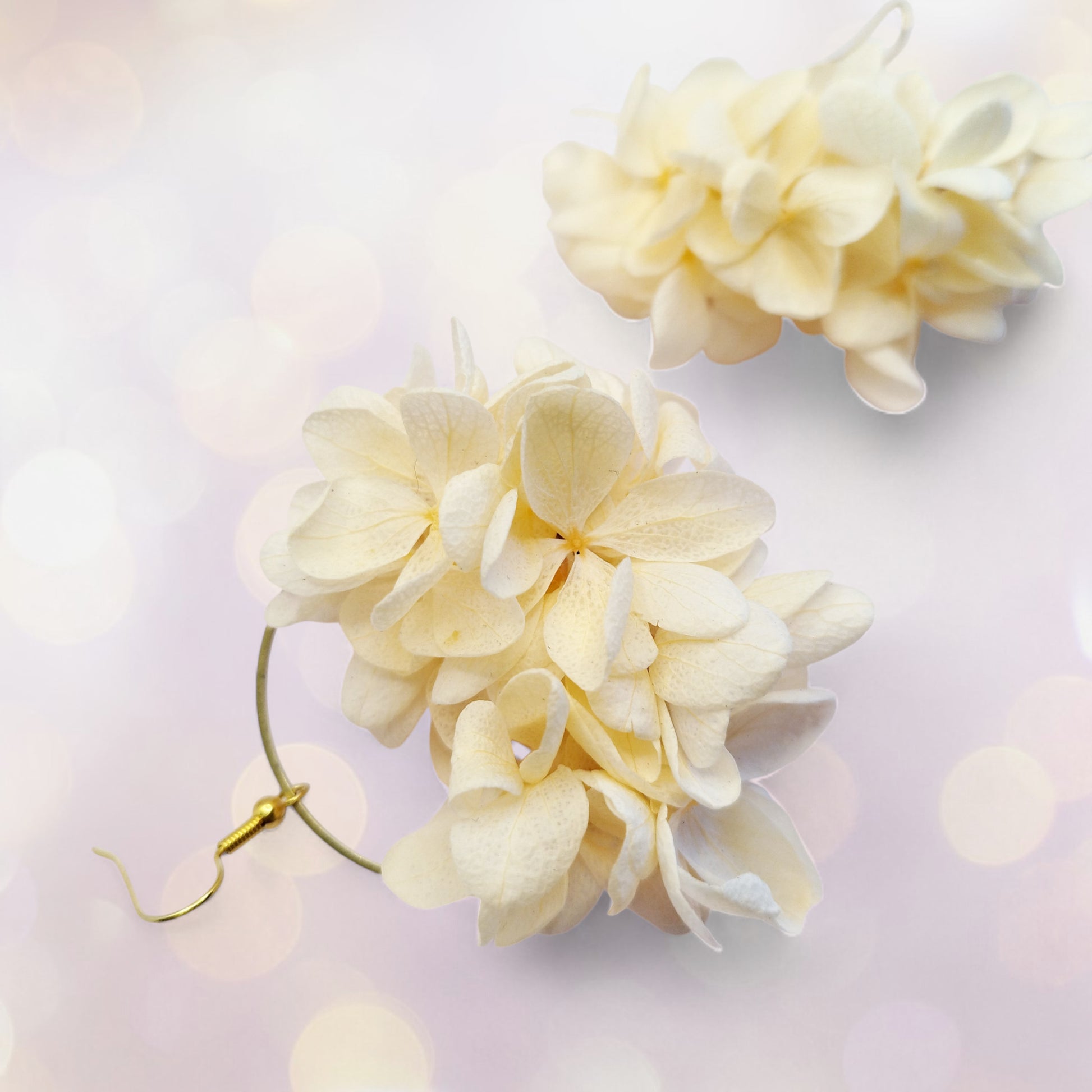 Boucles d'oreilles fleurs séchées mariage hortensia crème