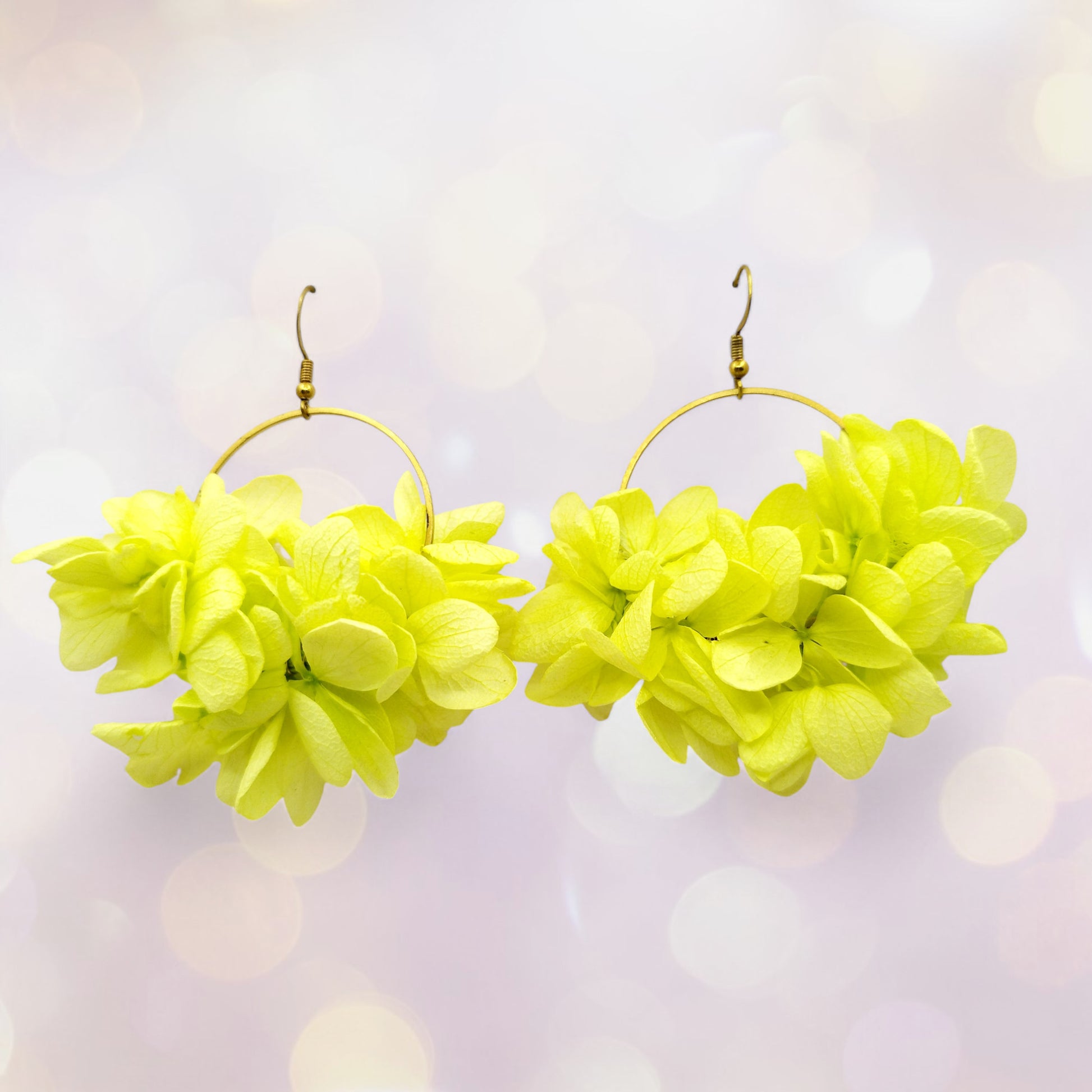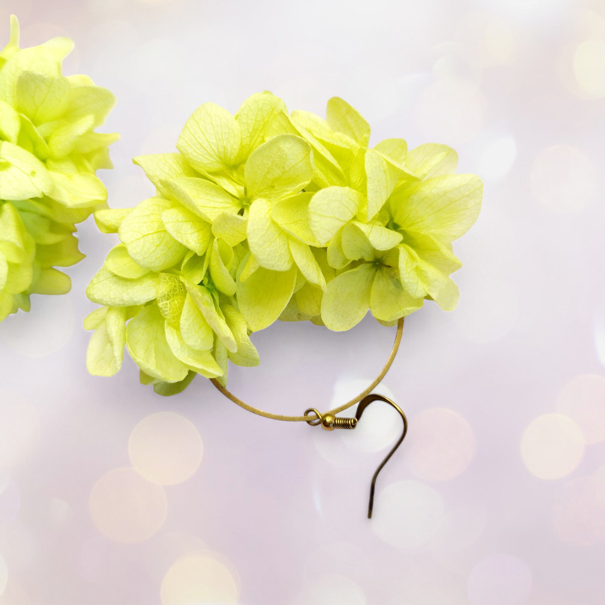 Chaque boucle se compose d'un cercle de laiton délicatement orné de fleurs d’hortensia.