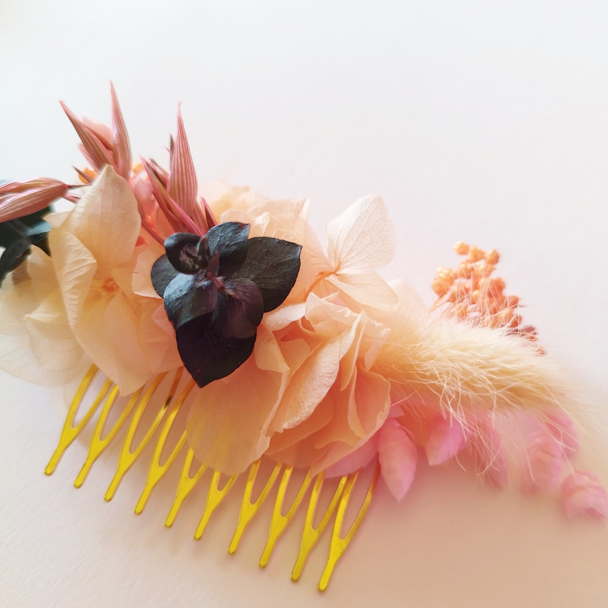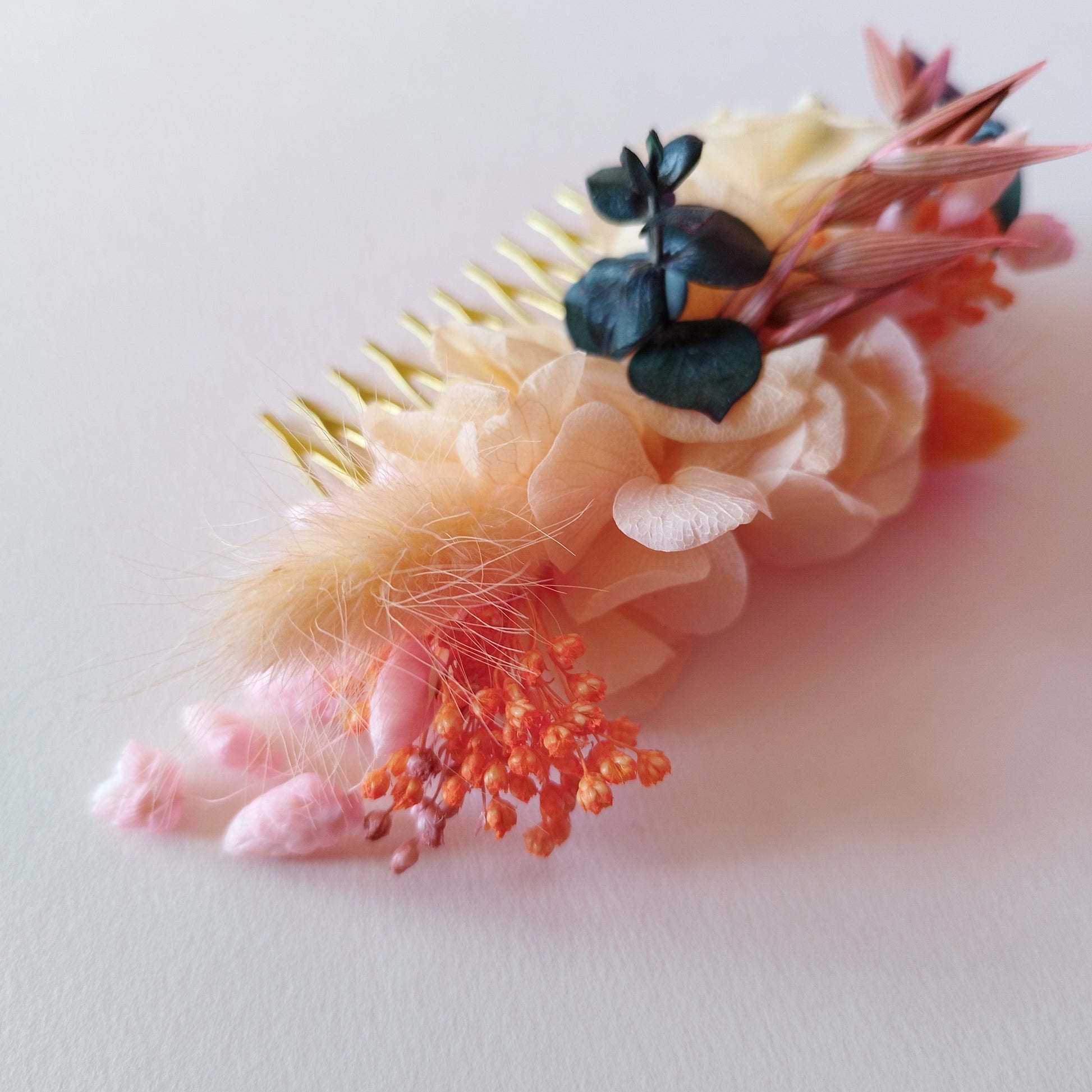 "Éclats Solaires" Peigne Floral fleurs séchées mariage– Rose, Orange & Pêche 🌞